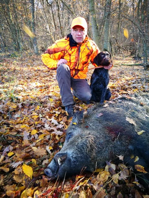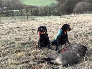 Cleo und Irme mit von ihnen gehaltenen Wildschwein